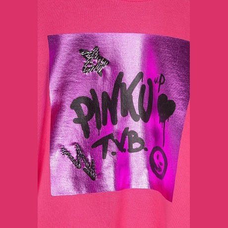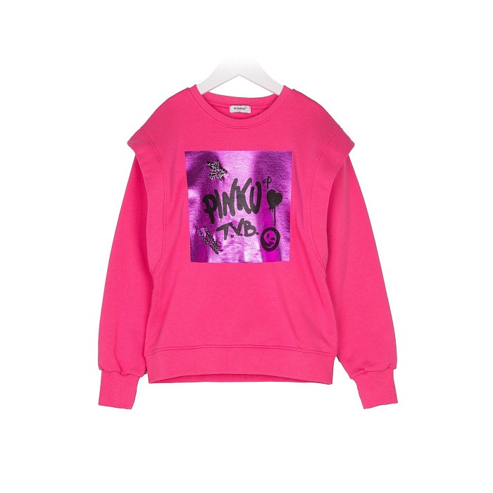 Розовый джемпер Pinko Up – это идеальный выбор для стильных девочек! Изготовлен из 100% хлопка, он украшен ярким принтом с надписью "Pinko Up" и граффити-элементами на розовом фоне. Нежный розовый цвет и стильный принт создают неповторимый образ. На фотографии видна аккуратная вышивка логотипа Pinko Up и мягкая текстура ткани. Качество от итальянского бренда и внимание к деталям делают этот джемпер отличным выбором для вашего ребенка!