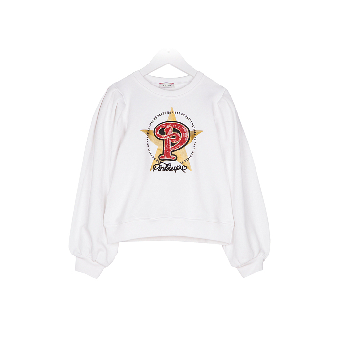 Джемпер Pinko Up – это идеальный выбор для девочек! Изготовленный из 100% хлопка, он украшен ярким принтом звезды и логотипа Pinko Up. Нежная белая основа с красными и золотыми акцентами создает стильный и в то же время уютный образ. На фотографии видна аккуратная белая окантовка по краю и мягкая текстура ткани. Качество от бренда из Италии и внимание к деталям делают этот джемпер отличным выбором для вашего малыша!