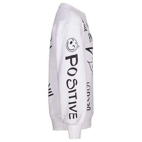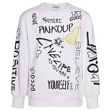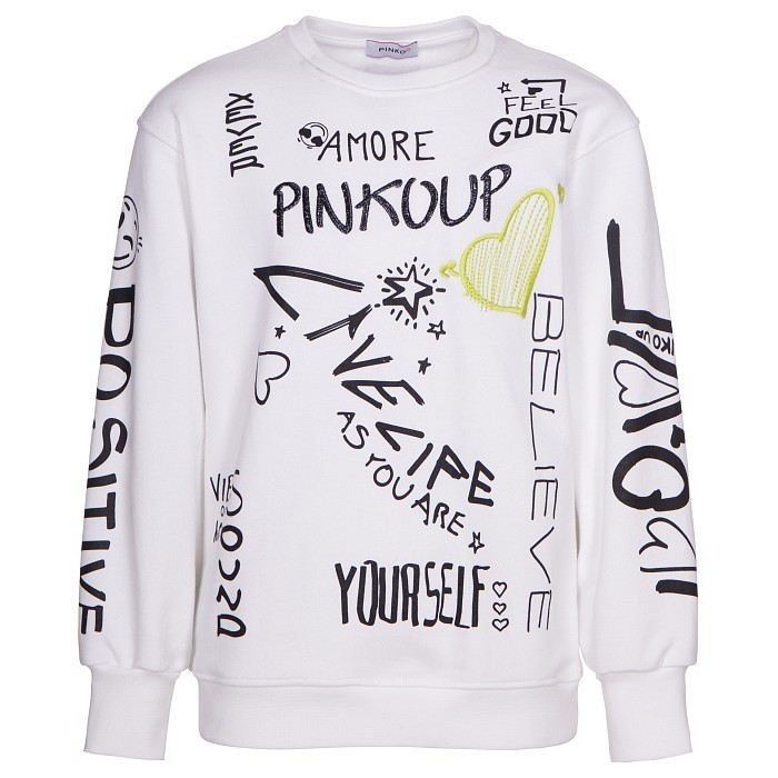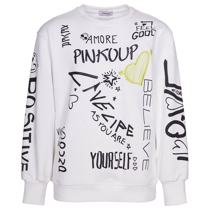 Джемпер Pinko Up – это идеальный выбор для стильных девочек! Изготовленный из 100% хлопка, он украшен яркими принтами и надписями, которые создают неповторимую атмосферу. На фотографии видны такие элементы дизайна, как надписи "AMORE", "PINKOUP", "LIVE LIFE AS YOU ARE", "YOURSELF", "BELIEVE", "FEEL GOOD", "POSITIVE", "GOOD VIBES", а также сердечки и звездочки. Нежная белая основа с черными и зелеными акцентами делает этот джемпер не только стильным, но и очень комфортным для нежной кожи. Качество итальянского бренда Pinko Up делают этот джемпер отличным выбором для вашего ребенка!