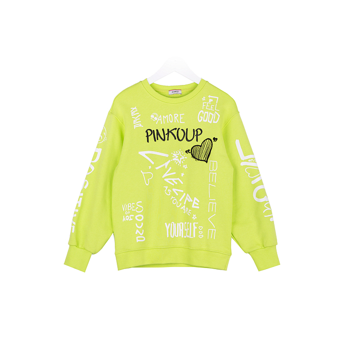 Джемпер Pinko Up – это идеальный выбор для стильных девочек! Изготовленный из 100% хлопка, он украшен ярким принтом и надписями, которые создают неповторимую атмосферу. На фотографии видны различные надписи, такие как "Pinkoup", "Live Life", "Believe", "Feel Good", а также сердечки и другие элементы дизайна. Джемпер с круглым вырезом горловины и длинными рукавами идеально подойдет для повседневной носки. Качество от итальянского бренда Pinko Up и внимание к деталям делают этот джемпер отличным выбором для вашего ребенка!