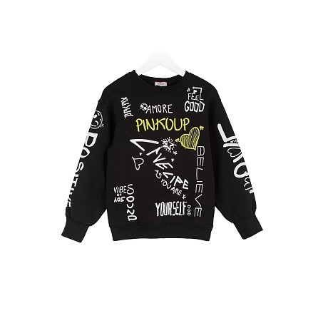 Джемпер Pinko Up – это идеальный выбор для маленьких модниц! Изготовленный из 100% хлопка, он украшен яркими надписями и принтами, которые создают уют и радость. Черный джемпер с белыми и желтыми надписями, сердечками и улыбками делает его особенно привлекательным. На фотографии видны яркие надписи "AMORE", "PINKOUP", "LIVE LIFE AS YOU ARE", "BELIEVE", "FEEL GOOD", а также улыбки и сердечки. Качество от итальянского бренда Pinko Up и внимание к деталям делают этот джемпер отличным выбором для вашего ребенка!