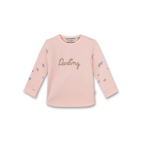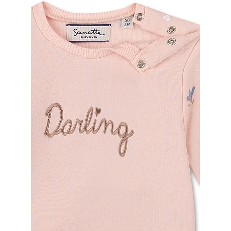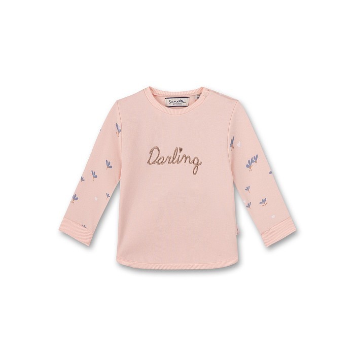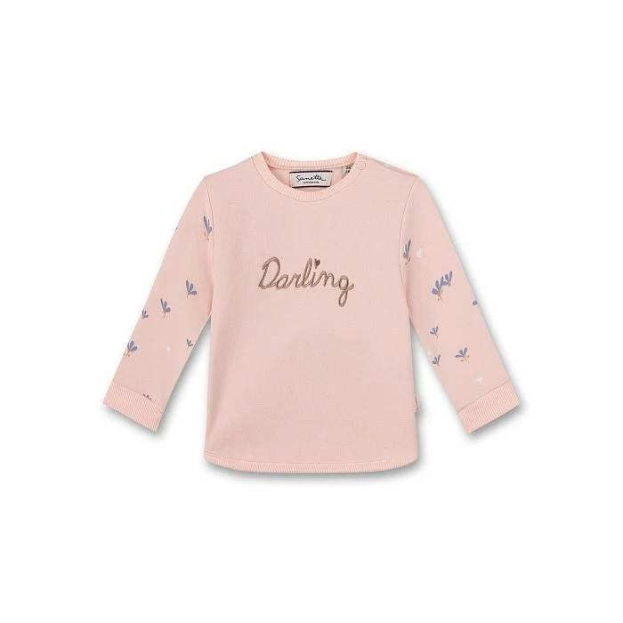 Джемпер Sanetta – это идеальный выбор для девочек! Изготовленный из 95% органического хлопка и 5% эластана, он украшен очаровательным принтом 'Darling' и цветочками на рукавах. Нежная розовая основа с золотистым принтом и цветочками создает нежное и уютное настроение. На фотографиях видна аккуратная вышивка 'Darling' и цветочки на рукавах. Качество от бренда Sanetta и внимание к деталям делают этот джемпер отличным выбором для вашего ребенка!