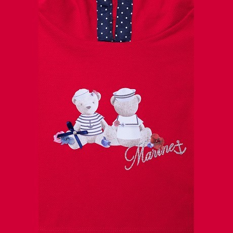 Красный джемпер Lapin House – это идеальный выбор для девочек! Изготовленный из 98% хлопка и 2% шелка, он украшен очаровательными медведями в морском стиле. Красный фон с белыми медведями в полосатых морских костюмах и шляпах создает яркий и веселый образ. На фотографии видна аккуратная белая окантовка по краю и мягкая текстура ткани. Качество от бренда из Греции и внимание к деталям делают этот джемпер отличным выбором для вашего ребенка!