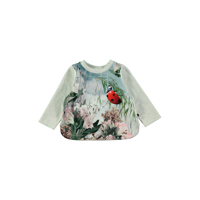 Джемпер Molo – это идеальный выбор для девочек! Изготовленный из 95% хлопка и 5% эластана, он украшен очаровательным принтом божьей коровки и цветов. Элегантная комбинация красного божьей коровки на фоне нежных розовых и белых цветов создает нежное и уютное настроение. На фотографии видна аккуратная белая окантовка по краю и мягкая текстура ткани. Качество от бренда из Украины и внимание к деталям делают этот джемпер отличным выбором для вашего ребенка!