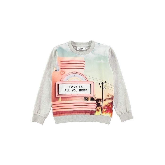 Джемпер Molo – это идеальный выбор для девочек! Изготовлен из 95% хлопка и 5% эластана, он украшен очаровательным принтом с надписью Love is All You Need и изображением пальм. Нежная текстура ткани и удобная посадка делают его комфортным для нежной кожи. На фотографиях видна аккуратная окантовка по краю и мягкая текстура ткани. Качество от бренда из Украины и внимание к деталям делают этот джемпер отличным выбором для вашего ребенка!