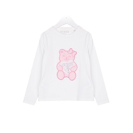 Фуфайка Guess – это идеальный выбор для девочек! Изготовленная из 95% хлопка и 5% эластана, она украшена очаровательным принтом медведя с бантиком и сердечком. Фуфайка белого цвета с розовым принтом создает нежное и уютное настроение. На фотографии видна аккуратная розовая контрастная окантовка по краю и мягкая текстура ткани. Качество от бренда Guess и внимание к деталям делают эту фуфайку отличным выбором для вашего ребенка!
