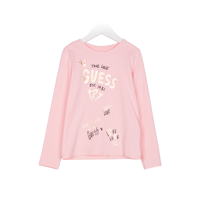 Фуфайка Guess – это идеальный выбор для девочек! Изготовленная из 95% хлопка и 5% эластана, она украшена стильным принтом Guess. Фуфайка выполнена в нежно-розовом цвете, на которой размещены различные надписи и символы, такие как "Guess", "True Love", "Est. 1981", "Every day with Guess" и "Love". Нежная ткань и удобная посадка делают эту фуфайку отличным выбором для вашего ребенка!