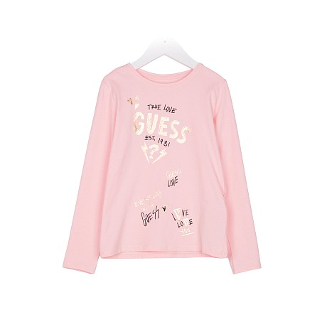 Фуфайка Guess – это идеальный выбор для девочек! Изготовленная из 95% хлопка и 5% эластана, она украшена стильным принтом Guess. Фуфайка выполнена в нежно-розовом цвете, на которой размещены различные надписи и символы, такие как "Guess", "True Love", "Est. 1981", "Every day with Guess" и "Love". Нежная ткань и удобная посадка делают эту фуфайку отличным выбором для вашего ребенка!