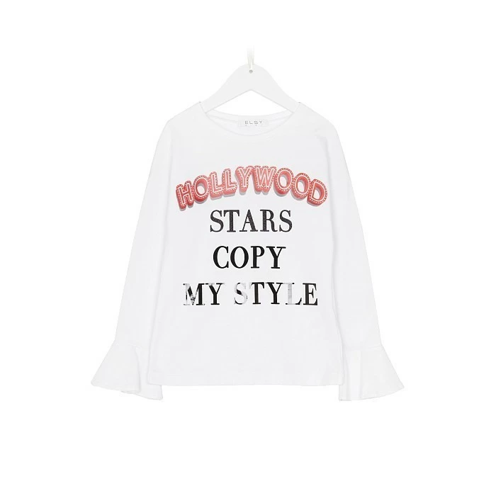 Футболка Elsy с принтом Hollywood – это идеальный выбор для маленьких модниц! Изготовлена из 95% хлопка и 5% эластана, она обеспечивает комфорт и мягкость для нежной кожи. Футболка украшена ярким принтом Hollywood и рукавами-фонариками, которые придают модели оригинальный и модный вид. На фотографии видна аккуратная вышивка с надписью "Hollywood Stars Copy My Style" и эластичные рукава-фонарики. Качество от итальянского бренда и внимание к деталям делают эту футболку отличным выбором для вашего ребенка!
