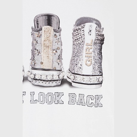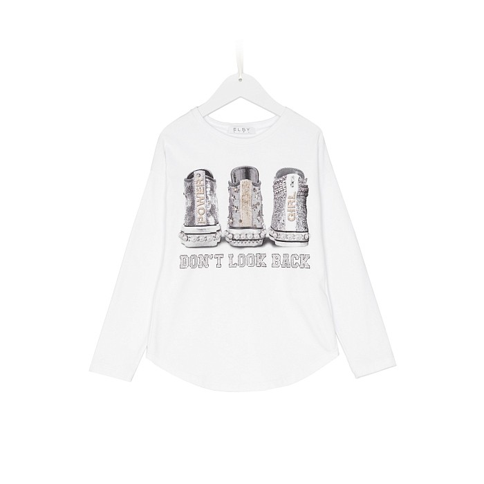 Футболка Elsy – это идеальный выбор для маленьких модниц! Изготовленная из 95% хлопка и 5% эластана, она украшена стильным принтом кроссовок и надписью Don't Look Back. Футболка идеально подходит для девочек от 18 до 2 лет. На фотографии видны яркие кроссовки с блестками и надписью Don't Look Back, а также мягкая и эластичная ткань. Качество от итальянского бренда и внимание к деталям делают эту футболку отличным выбором для вашего ребенка!