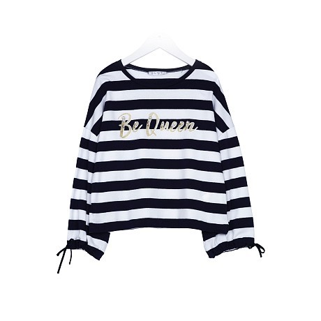 - 🎨 Дизайн: черно-белые полосы, золотистый принт Be Queen, эластичные завязки на рукавах