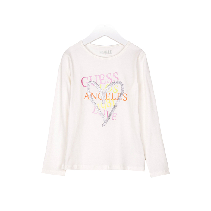 Футболка Guess для девочек – это идеальный выбор для стильных и активных девочек! Изготовленная из 95% хлопка и 5% эластана, она украшена ярким принтом сердца с надписью Los Angeles. Нежная белая основа с яркими цветами и блестящим сердцем создает яркий и модный образ. На фотографии видно, как блестит сердце и надпись, а также эластичная резинка на воротнике. Качество от бренда Guess и внимание к деталям делают эту футболку отличным выбором для вашего ребенка!