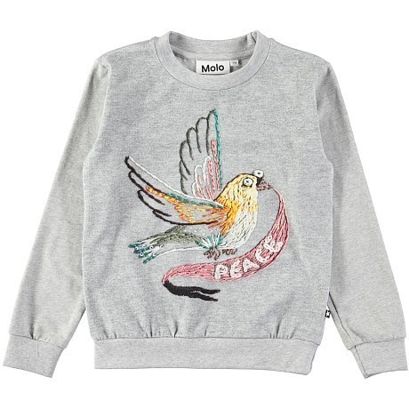Футболка с длинным рукавом Molo – это идеальный выбор для девочек! Изготовленная из 95% хлопка и 5% эластана, она украшена очаровательным принтом голубя с надписью PEACE. Нежная серая основа с ярким принтом создает уютное и в то же время стильное настроение. На фотографии видна аккуратная контрастная окантовка по краю и мягкая текстура ткани. Качество от бренда из Украины и внимание к деталям делают эту футболку отличным выбором для вашего ребенка!