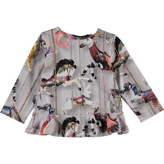 Футболка Molo с длинным рукавом – это идеальный выбор для девочек! Изготовленная из 95% хлопка и 5% эластана, она украшена очаровательным принтом карусели с разноцветными лошадками, зебрами и другими животными на сером фоне. Нежная ткань с яркими деталями создает яркое и веселое настроение. На фотографиях видна аккуратная детализация принта и мягкая текстура ткани. Качество от бренда из Украины и внимание к деталям делают эту футболку отличным выбором для вашего ребенка!