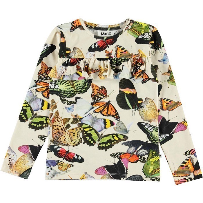 Футболка Molo с длинным рукавом – это идеальный выбор для девочек! Изготовленная из 95% хлопка и 5% эластана, она украшена ярким принтом с множеством разноцветных бабочек. Нежная белая основа с яркими бабочками создает легкое и в то же время стильное настроение. На фотографии видна аккуратная белая окантовка по краю и мягкая текстура ткани. Качество от бренда из Индии и внимание к деталям делают эту футболку отличным выбором для вашего ребенка!