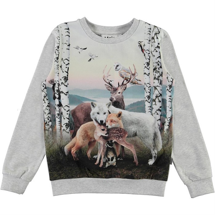 Футболка Molo с длинным рукавом – это идеальный выбор для девочек! Изготовленная из 95% органического хлопка и 5% эластана, она украшена очаровательным принтом с лесными животными: белыми оленями, белыми волками, рыжими лисами и другими животными на фоне леса. Нежная текстура ткани и удобная посадка делают эту футболку комфортной и стильной. На фотографии видна аккуратная белая окантовка по краю и мягкая текстура ткани. Качество от датского бренда Molo и внимание к деталям делают эту футболку отличным выбором для вашего ребенка!