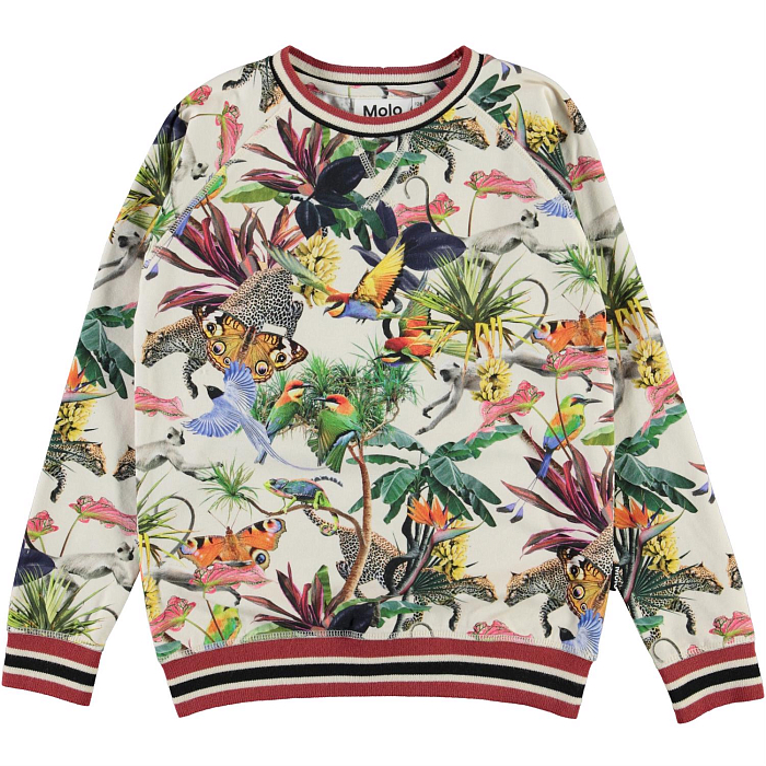 Футболка Molo с длинным рукавом – это идеальный выбор для девочек! Изготовленная из 95% органического хлопка и 5% эластана, она украшена ярким тропическим принтом с животными и растениями. Нежная белая основа с яркими красными, зелеными и оранжевыми акцентами создает игривое и вдохновляющее настроение. На фотографии видна аккуратная красная контрастная окантовка по краю и мягкая текстура ткани. Качество от бренда из Дании и внимание к деталям делают эту футболку отличным выбором для вашего ребенка!