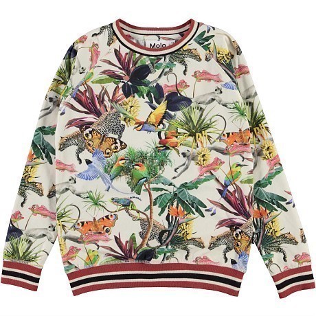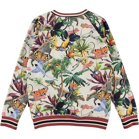 Футболка Molo с длинным рукавом – это идеальный выбор для девочек! Изготовленная из 95% органического хлопка и 5% эластана, она украшена ярким тропическим принтом с животными и растениями. Нежная белая основа с яркими красными, зелеными и оранжевыми акцентами создает игривое и вдохновляющее настроение. На фотографии видна аккуратная красная контрастная окантовка по краю и мягкая текстура ткани. Качество от бренда из Дании и внимание к деталям делают эту футболку отличным выбором для вашего ребенка!