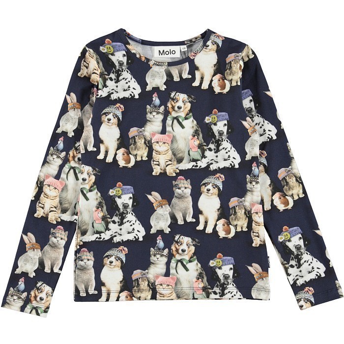 Футболка Molo с длинным рукавом – это идеальный выбор для девочек! Изготовленная из 95% органического хлопка и 5% эластана, она украшена очаровательными изображениями животных: кошек, собак, кроликов и даже птиц. На футболке видны милые головные уборы и бантчики, которые добавляют игривости и радости. Нежная ткань и удобная посадка делают эту футболку отличным выбором для вашего ребенка!