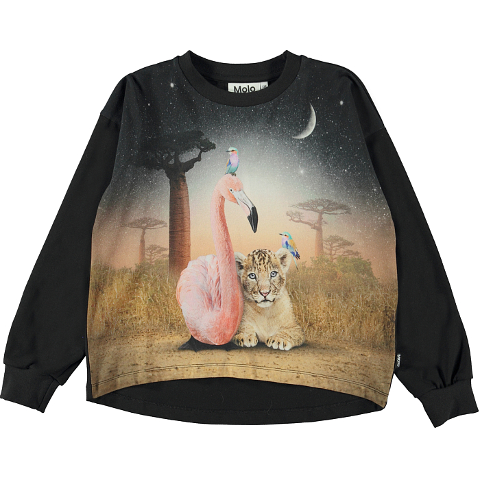 Футболка с длинным рукавом Molo – это идеальный выбор для маленьких модниц! Изготовленная из 95% хлопка органического и 5% эластана, она украшена очаровательным принтом с львом, фламинго и другими животными на фоне ночного неба. Нежная черная основа с яркими деталями создает стильный и комфортный образ. На фотографиях видна аккуратная черная окантовка по краю и мягкая текстура ткани. Качество от бренда из Дании и внимание к деталям делают эту футболку отличным выбором для вашего ребенка!