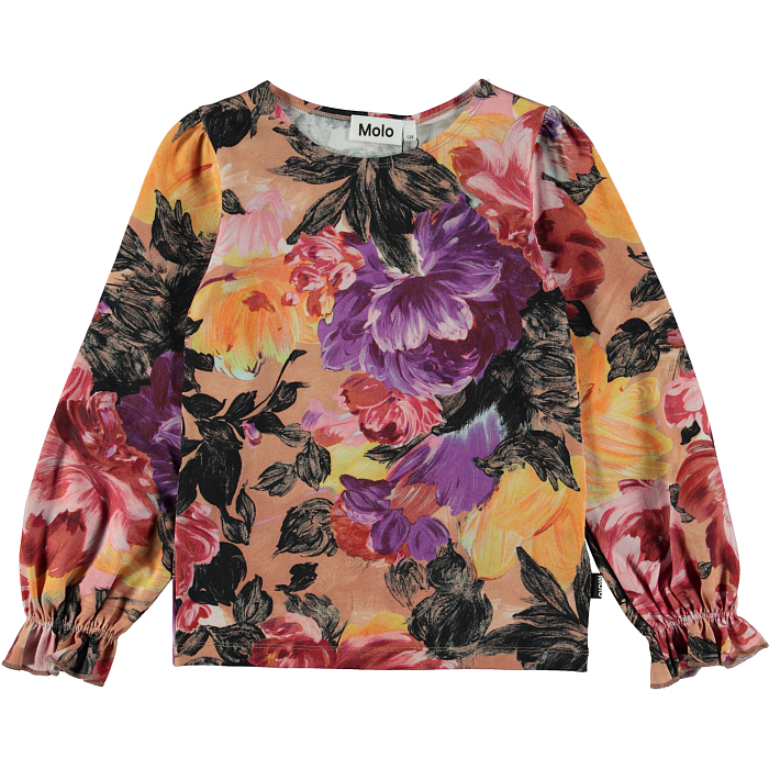 Футболка Molo с длинным рукавом – это идеальный выбор для девочек! Изготовленная из 95% натурального хлопка и 5% эластана, она украшена ярким цветочным принтом с крупными розами, пионами и лилиями на фоне нежно-розового цвета. Футболка с длинными рукавами и эластичными манжетами создает комфорт и уют для вашего ребенка. На фотографиях видна аккуратная окантовка по краю и мягкая текстура ткани. Качество от бренда из Дании и внимание к деталям делают эту футболку отличным выбором для вашего малыша!