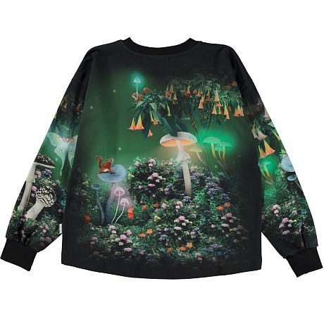 Футболка Molo с длинным рукавом – это идеальный выбор для девочек! Изготовленная из 95% натурального хлопка и 5% эластана, она украшена очаровательным принтом леса и животных. На футболке изображены милые животные, такие как белый волк, белый медведь, кошки и лиса, а также красивые цветы и грибы. Нежная черная основа с яркими деталями создает волшебное настроение. На фотографиях видны аккуратные детали, такие как черная окантовка по краю и мягкая текстура ткани. Качество от бренда из Дании и внимание к деталям делают эту футболку отличным выбором для вашего ребенка!