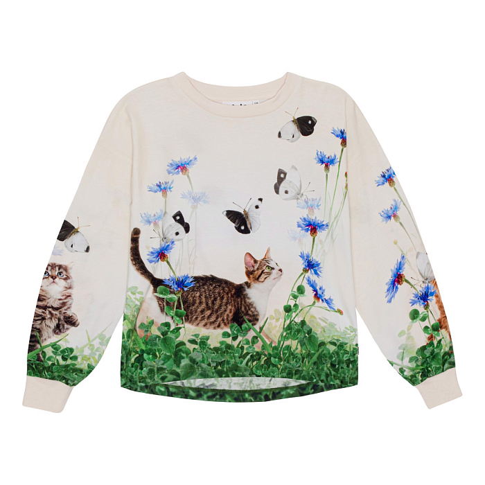Футболка с длинным рукавом для девочек молочного цвета с принтом кошек и бабочек