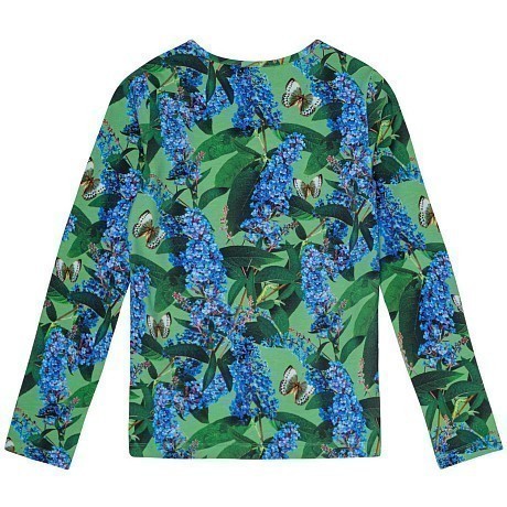Футболка с длинным рукавом Molo – это идеальный выбор для девочек! Изготовленная из 95% натурального хлопка и 5% эластана, она украшена изысканным цветочным принтом с бабочками на зеленом фоне. Красивые синие цветы и зеленые листья создают нежный и романтичный настрой. На фотографиях видны аккуратные бабочки разного размера и цвета, а также мягкая текстура ткани. Качество от бренда из Дании и внимание к деталям делают эту футболку отличным выбором для вашего ребенка!