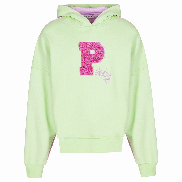 Толстовка Pinko Up – это идеальный выбор для девочек! Изготовленная из 100% хлопка, она украшена крупным ярким принтом буквы P и контрастной розовой окантовкой по краю. Нежная зеленая основа с розовыми деталями создает яркий и стильный образ. На фотографии видна аккуратная розовая окантовка по краю и мягкая текстура ткани. Качество от итальянского бренда и внимание к деталям делают эту толстовку отличным выбором для вашего ребенка!