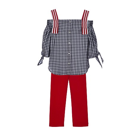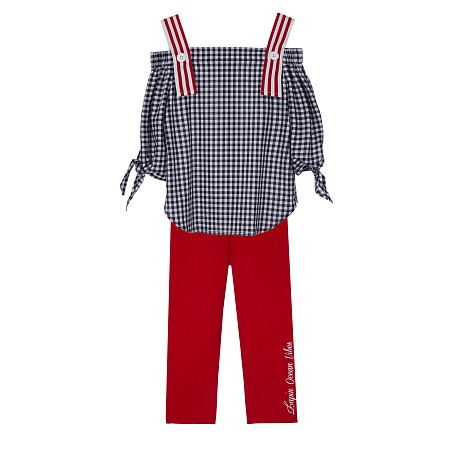 Комплект блуза+брюки Lapin House – идеальный выбор для вашего маленькой модницы! Изготовленный из 100% хлопка и 95% хлопка, 5% эластана, он сочетает в себе комфорт и стиль. Блуза в клетку с красными бретелями и мягкими рукавами создает нежный и элегантный образ. Брюки с красными бретелями и надписью на боку добавляют яркости и индивидуальности. Качество от бренда из Греции и внимание к деталям делают этот комплект отличным выбором для вашего ребенка!