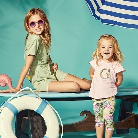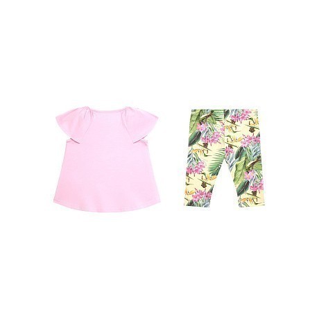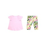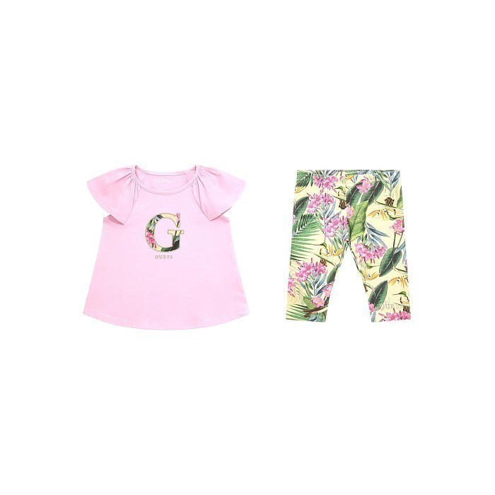 Комплект футболка+брюки Guess – это идеальный выбор для маленькой модницы! Футболка с нежно-розовым цветом и принтом логотипа Guess, а также брюки с тропическим принтом в виде цветов и листьев. Мягкая и дышащая ткань из 95% хлопка и 5% эластана создает идеальную посадку и комфорт. На футболке виден яркий логотип Guess, а на брюках – тропический принт с розовыми цветами и зелеными листьями. Качество от бренда из США делает этот комплект отличным выбором для вашего ребенка!