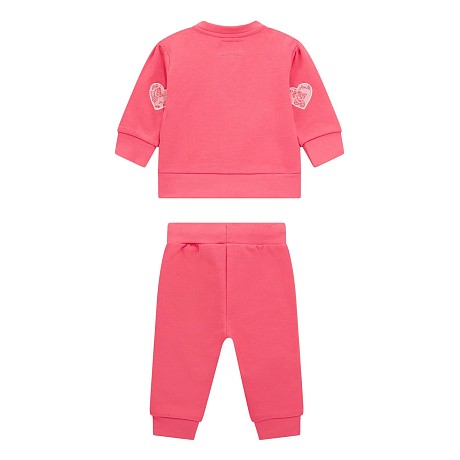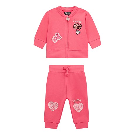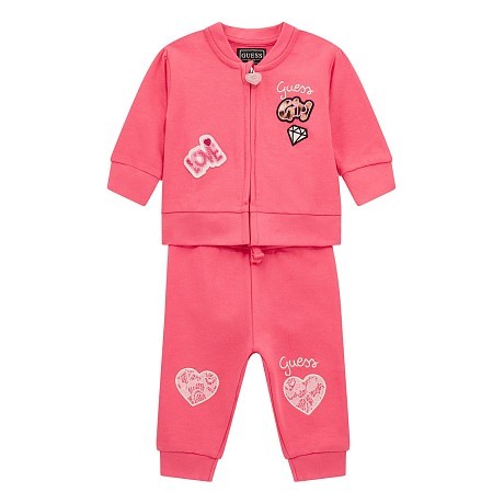 Комплект тренировочный Guess – это идеальный выбор для девочек 12-18 месяцев! Изготовлен из 100% хлопка, он украшен стильными принтами и логотипом Guess. Куртка и брюки выполнены в ярком розовом цвете, на которых видны такие элементы как надпись "Love", бриллиант, логотип Guess и кружевные сердечки. Нежная ткань и удобная посадка делают этот комплект идеальным для тренировок и повседневной носки. На фотографиях видна аккуратная застежка на молнии и мягкая текстура ткани. Качество от бренда из США и внимание к деталям делают этот комплект отличным выбором для вашего ребенка!