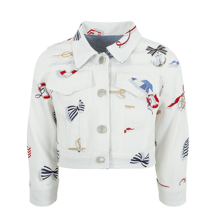Джинсовая куртка Lapin House – это идеальный выбор для девочек! Изготовленная из 97% хлопка и 3% лайкры, она украшена очаровательными морскими принтами: якори, рули, шкивы, були и флаги. Белая основа с яркими морскими акцентами создает игривое и в то же время стильное настроение. На фотографиях видна аккуратная белая окантовка по краю и мягкая текстура ткани. Качество от бренда из Греции и внимание к деталям делают эту куртку отличным выбором для вашего ребенка!