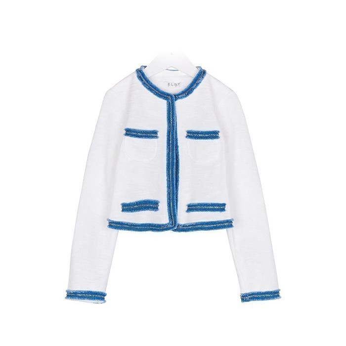 Жакет Elsy – это идеальный выбор для маленькой модницы! Изготовленный из 100% хлопка, он украшен стильными голубыми вставками, которые придают изделию яркость и модный вид. На фотографии видны аккуратные голубые вставки на карманах и вдоль переда, а также контрастная голубая окантовка по краю. Качество от бренда из Румынии и внимание к деталям делают этот жакет отличным выбором для вашего ребенка!