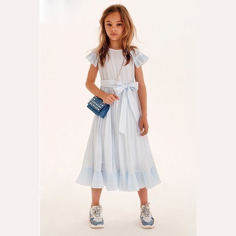 Платье Elsy – это идеальный выбор для девочек! Изготовленное из комбинации 65% полиэстера и 35% хлопка с подкладкой из 100% хлопка, оно украшено элегантными голубыми полосками и бантом на талии. Классический дизайн с нежными полосками и аккуратным бантом создает неповторимый и стильный образ для вашего ребенка. На фотографии видна аккуратная голубая полоска по всей длине платья и мягкая текстура ткани. Качество от итальянского бренда Elsy делает это платье отличным выбором для вашего маленькой модницы!
