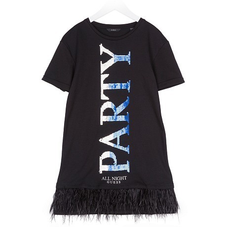 Платье Guess – это идеальный выбор для девочек, которые любят яркие и стильные вещи! Изготовленное из 100% хлопка и пера, оно украшено блестящими буквами 'Party All Night' и черными перьями, которые придают платью неповторимый шик. Нежная ткань и блестящие элементы создают идеальный образ для вечеринки. На фотографии видна блестящая надпись и черные перья по краю, а также удобная посадка и эластичная резинка на талии. Качество от Китая и внимание к деталям делают это платье отличным выбором для вашего ребенка!