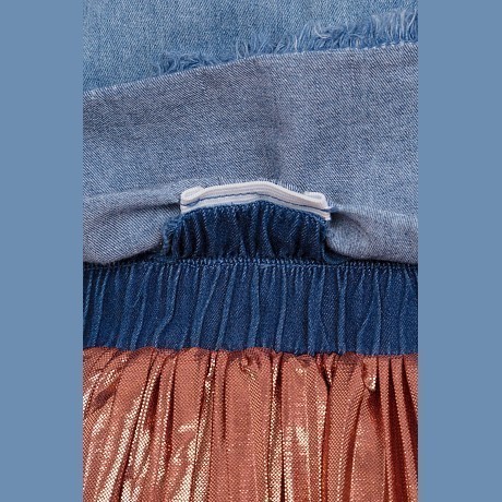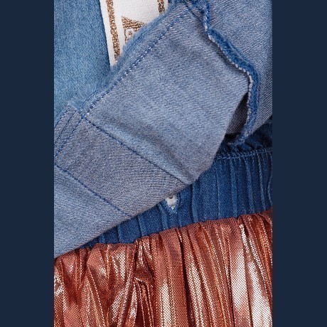 • 👗 Дизайн: джинсовый верх, плиссированная юбка, блестящий эффект