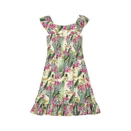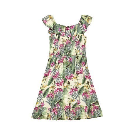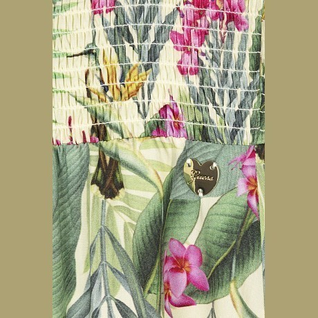 Платье Guess – это идеальный выбор для девочек! Изготовленное из вискозы и лиоцелла, оно украшено ярким тропическим принтом с розовыми цветами и зелеными листьями на белом фоне. Нежная ткань с аккуратными воланами по краю создает легкость и комфорт. На фотографиях видна аккуратная отделка воротника и мягкость ткани. Качество от американского бренда Guess делает эту одежду отличным выбором для вашего ребенка!