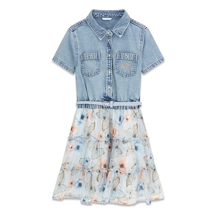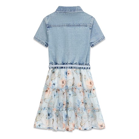 Платье Guess – это идеальный выбор для маленьких модниц! Изготовленное из 100% хлопка, оно украшено нежным цветочным принтом с бабочками и розами на светло-голубом фоне. Платье с короткими рукавами и отложным воротником идеально подойдет для девочек от 2 до 6 лет. На фотографиях видна аккуратная голубая окантовка по краю и мягкая текстура ткани. Качество от американского бренда Guess и внимание к деталям делают эту модель отличным выбором для вашего ребенка!