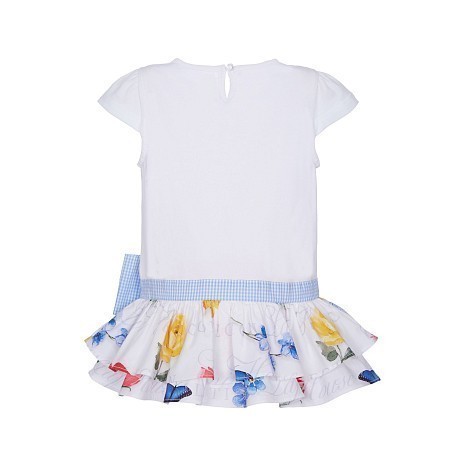 Платье Lapin House – это идеальный выбор для девочек! Изготовленное из 95% хлопка и 5% эластана, оно украшено очаровательным цветочным принтом и мягким бантом. Нежная белая основа с яркими цветами и бабочками создает нежное и в то же время яркое настроение. На фотографии видна аккуратная голубая контрастная окантовка по краю и мягкая текстура ткани. Качество от бренда из Греции и внимание к деталям делают эту модель отличным выбором для вашего ребенка!