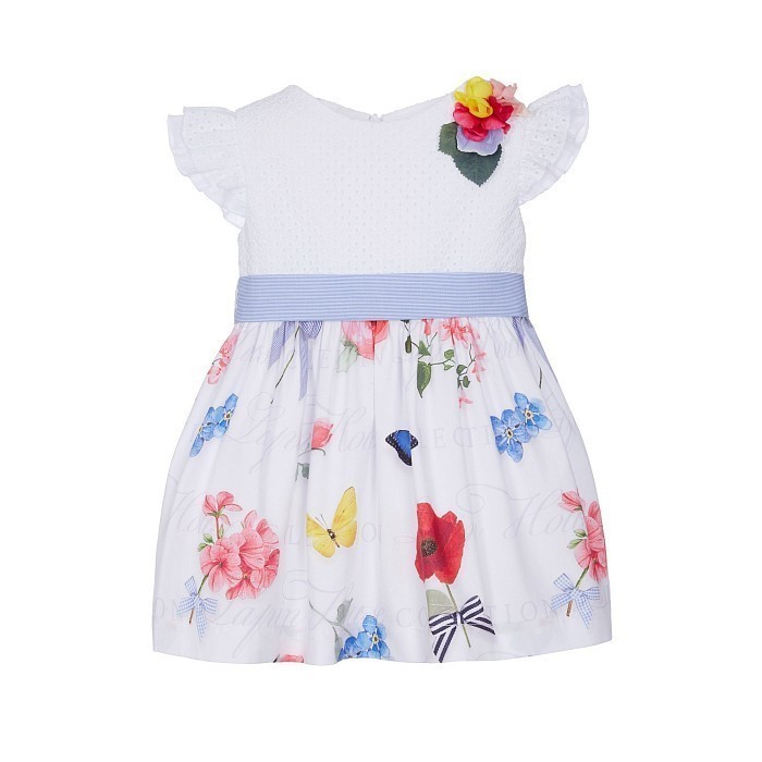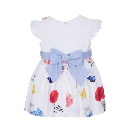Платье для девочки Lapin House – это идеальный выбор для маленьких модниц! Изготовленное из 98% хлопка и 2% эластана, оно украшено ярким цветочным принтом с бабочками и бантом на поясе. Нежная белая основа с красными, розовыми и синими цветами создает волшебное настроение. На фотографии видна аккуратная голубая окантовка по краю и мягкая текстура ткани. Качество от бренда из Греции и внимание к деталям делают эту модель отличным выбором для вашего ребенка!