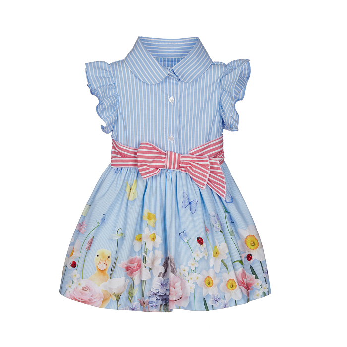 Платье Lapin House – это идеальный выбор для девочек! Изготовленное из 99% хлопка и 1% лайкры, оно украшено очаровательными птичками, цветами и бабочками на светло-голубом фоне. Нежная ткань с яркими деталями создает легкое и веселое настроение. На фотографии видна аккуратная розовая лента с белыми полосками поясом, а также милые птички и цветы на юбке. Качество от бренда из Греции и внимание к деталям делают эту модель отличным выбором для вашего ребенка!