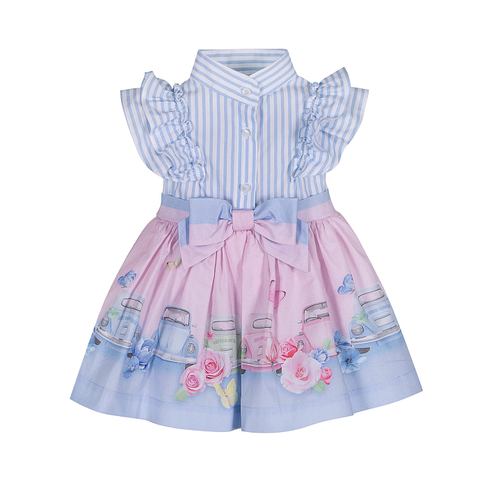 - 🎨 Дизайн: ретро автомобили, цветы, лента на талии, рюши на рукавах