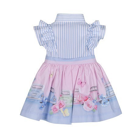 - 🎨 Дизайн: ретро автомобили, цветы, лента на талии, рюши на рукавах