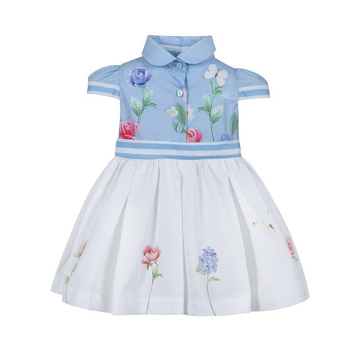 Платье для девочек Lapin House – это идеальный выбор для маленьких модниц! Изготовленное из 99% хлопка и 1% лайкры, оно украшено очаровательным цветочным принтом с розами, бабочками и зелеными листьями на белом фоне. Классический воротничок и короткие рукава делают это платье стильным и удобным. На фотографиях видны аккуратные голубые контрастные окантовки по краю и мягкая текстура ткани. Качество от бренда из Греции и внимание к деталям делают эту модель отличным выбором для вашего ребенка!