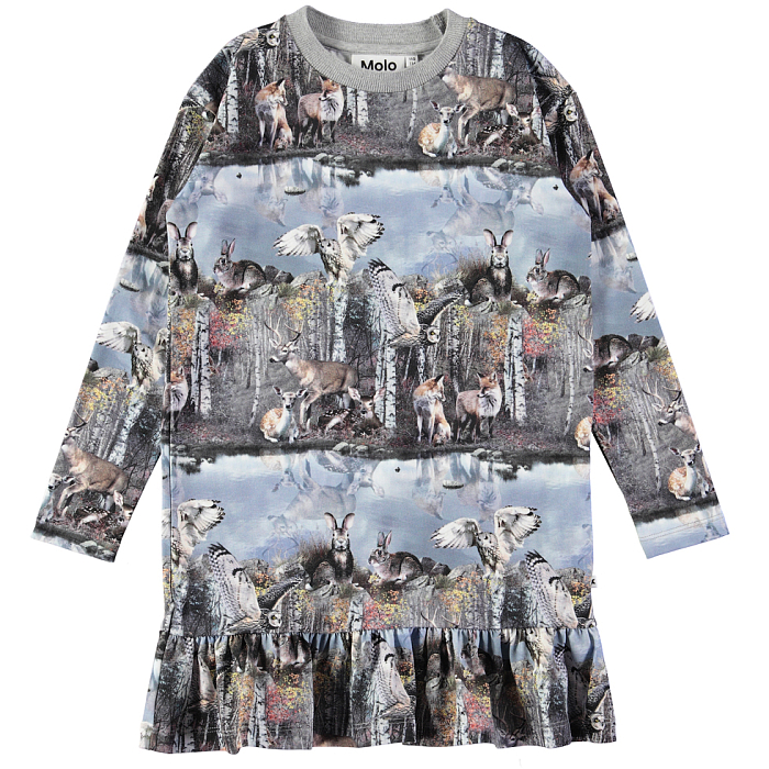 Платье Molo – это идеальный выбор для девочек! Изготовленное из 95% хлопка и 5% эластана, оно украшено очаровательным принтом с лесными животными и деревьями. Нежная ткань с яркими изображениями животных и деревьев создает уютное и в то же время яркое настроение. На фотографии видна аккуратная детализация принта с изображением зайцев, лис, сов и других лесных обитателей. Качество от бренда из Украины и внимание к деталям делают эту одежду отличным выбором для вашего ребенка!