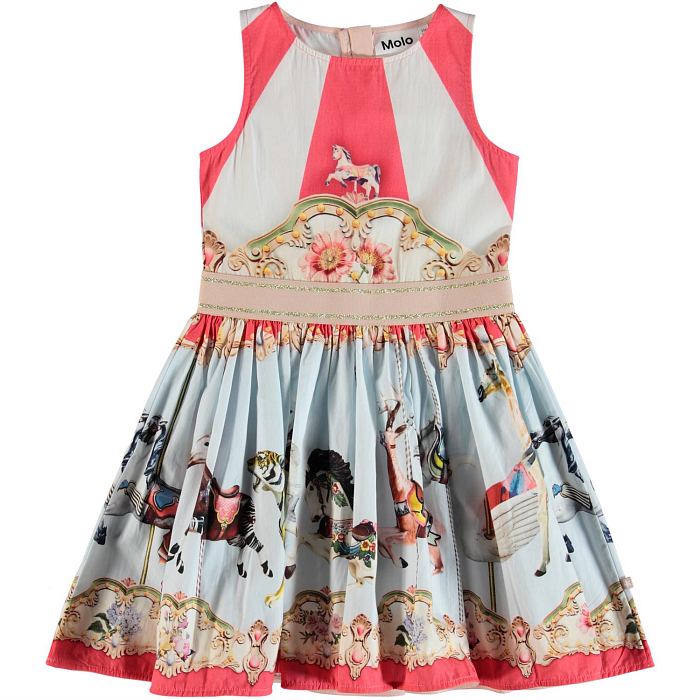 Платье Molo – это идеальный выбор для маленькой модницы! Изготовленное из 100% хлопка, оно украшено очаровательным принтом с изображением карусели и животных. Яркие цвета и детали создают волшебное настроение. На фотографии видна аккуратная розовая окантовка по краю и мягкая текстура ткани. Качество от бренда из Индии и внимание к деталям делают эту модель отличным выбором для вашего ребенка!