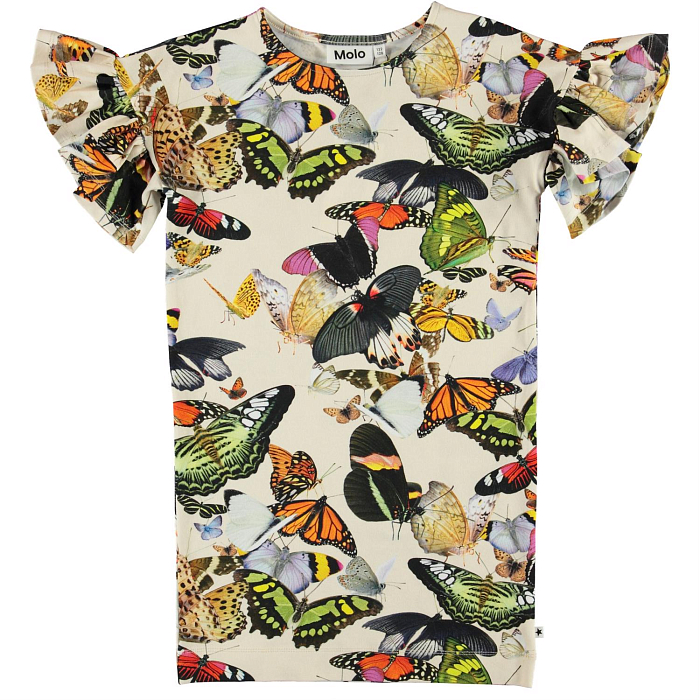 Платье Molo – это идеальный выбор для маленьких модниц! Изготовленное из 95% хлопка и 5% эластана, оно украшено очаровательным принтом с разноцветными бабочками на светлой основе. Яркие и разнообразные бабочки создают волшебное настроение и идеально подойдут для весеннего или летнего гардероба. На фотографии видна аккуратная белая окантовка по краю и мягкая текстура ткани. Качество от бренда из Индии и внимание к деталям делают эту модель отличным выбором для вашего ребенка!