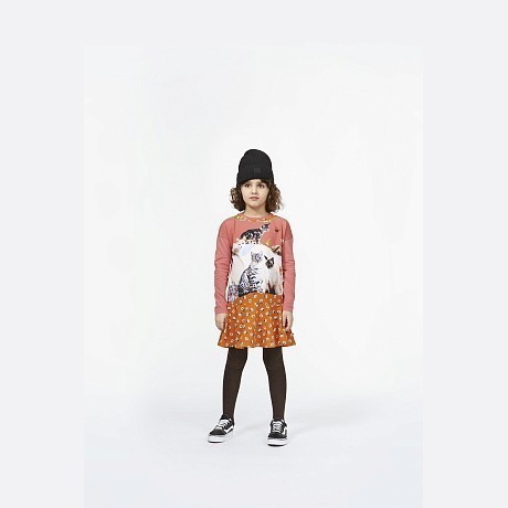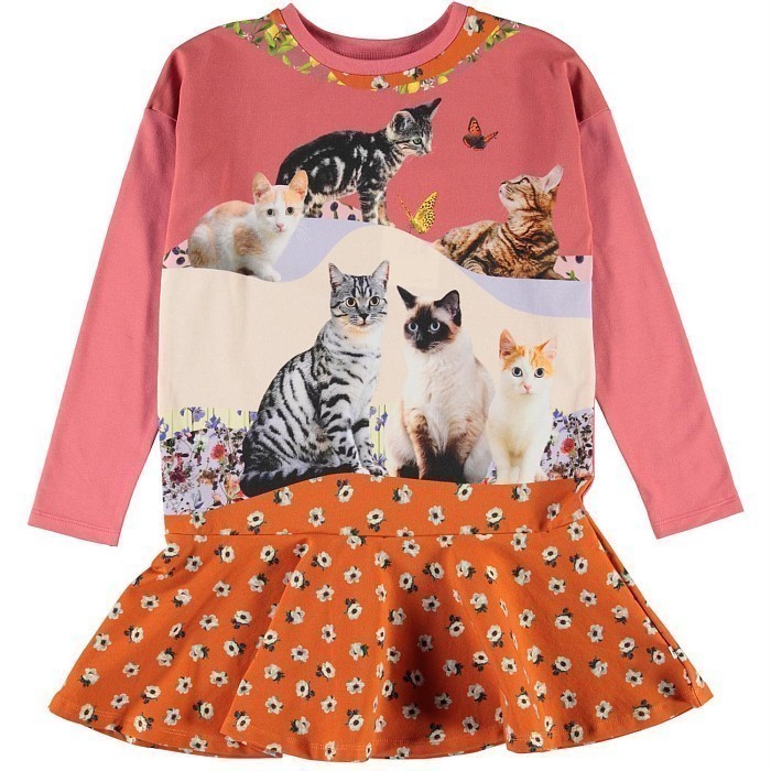 Платье Molo – это идеальный выбор для девочек! Изготовленное из 95% хлопка и 5% эластана, оно украшено очаровательными кошками и бабочками на розовом фоне. Нежная ткань с яркими принтами создает игривое и в то же время уютное настроение. На фотографии видны аккуратные края, мягкая текстура ткани и яркие принты кошек и бабочек. Качество от бренда из Индии и внимание к деталям делают эту одежду отличным выбором для вашего ребенка!