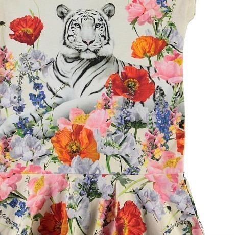 Платье Molo с изящным принтом тигра и цветов – идеальный выбор для маленькой модницы! Изготовлено из 95% органического хлопка и 5% эластана, что делает его мягким и эластичным. Принт с белым тигром и яркими цветами создает волшебное настроение, а рюш на юбке придает модели легкости и изысканности. Качество от бренда из Дании и внимание к деталям делают это платье отличным выбором для вашего ребенка!
